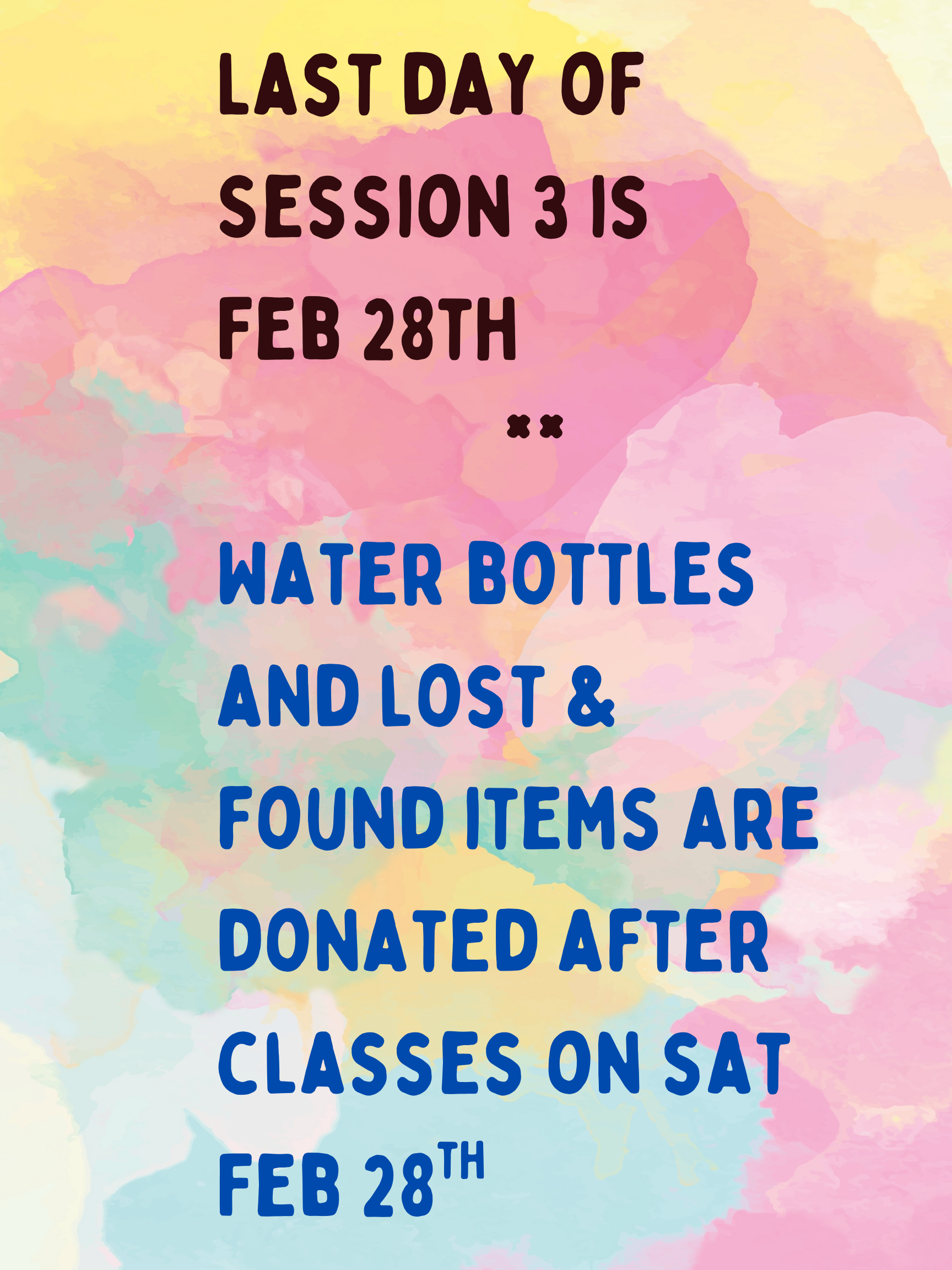 All lost & found items, including water bottles, will be discarded at end of the session (at 2 p.m. on Saturday, Dec 20th).
