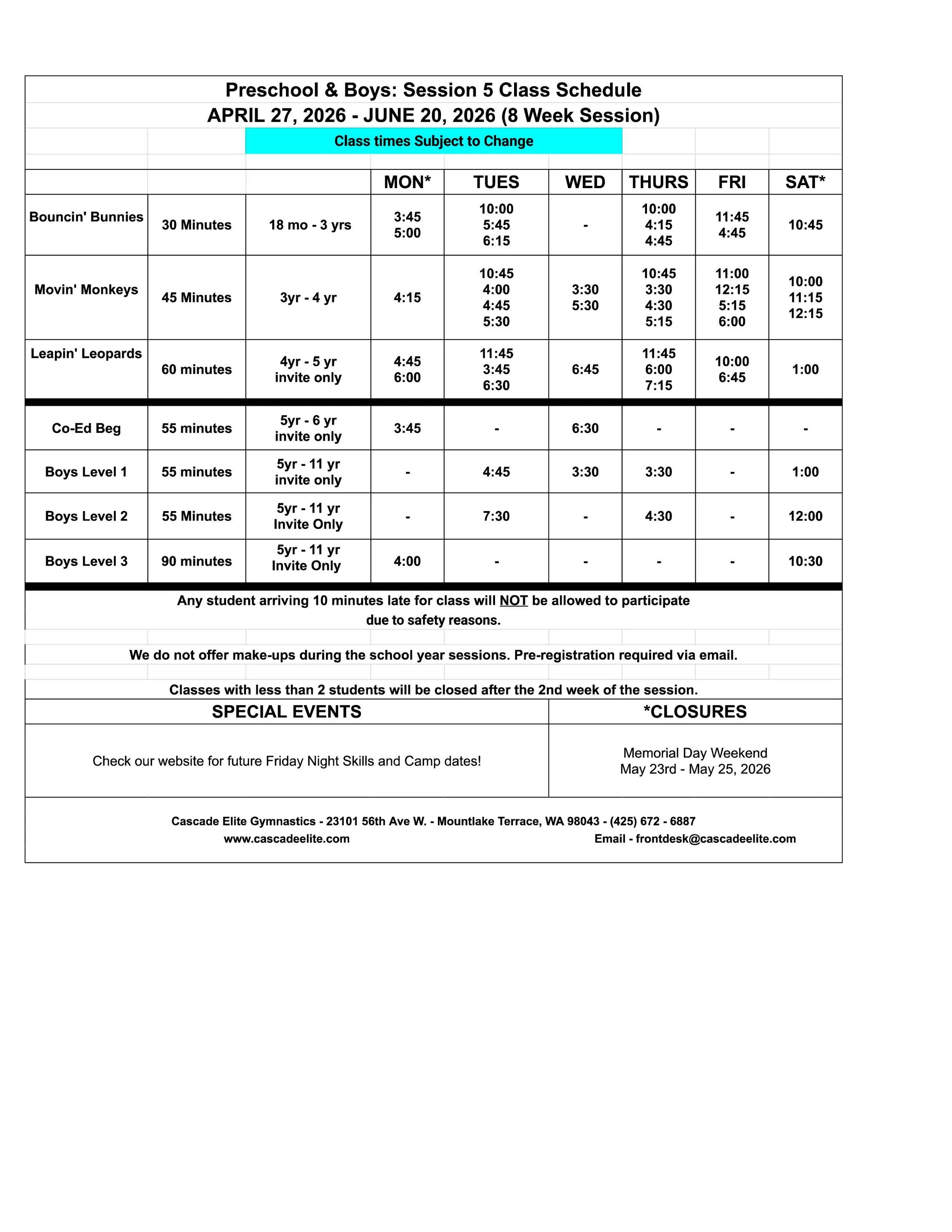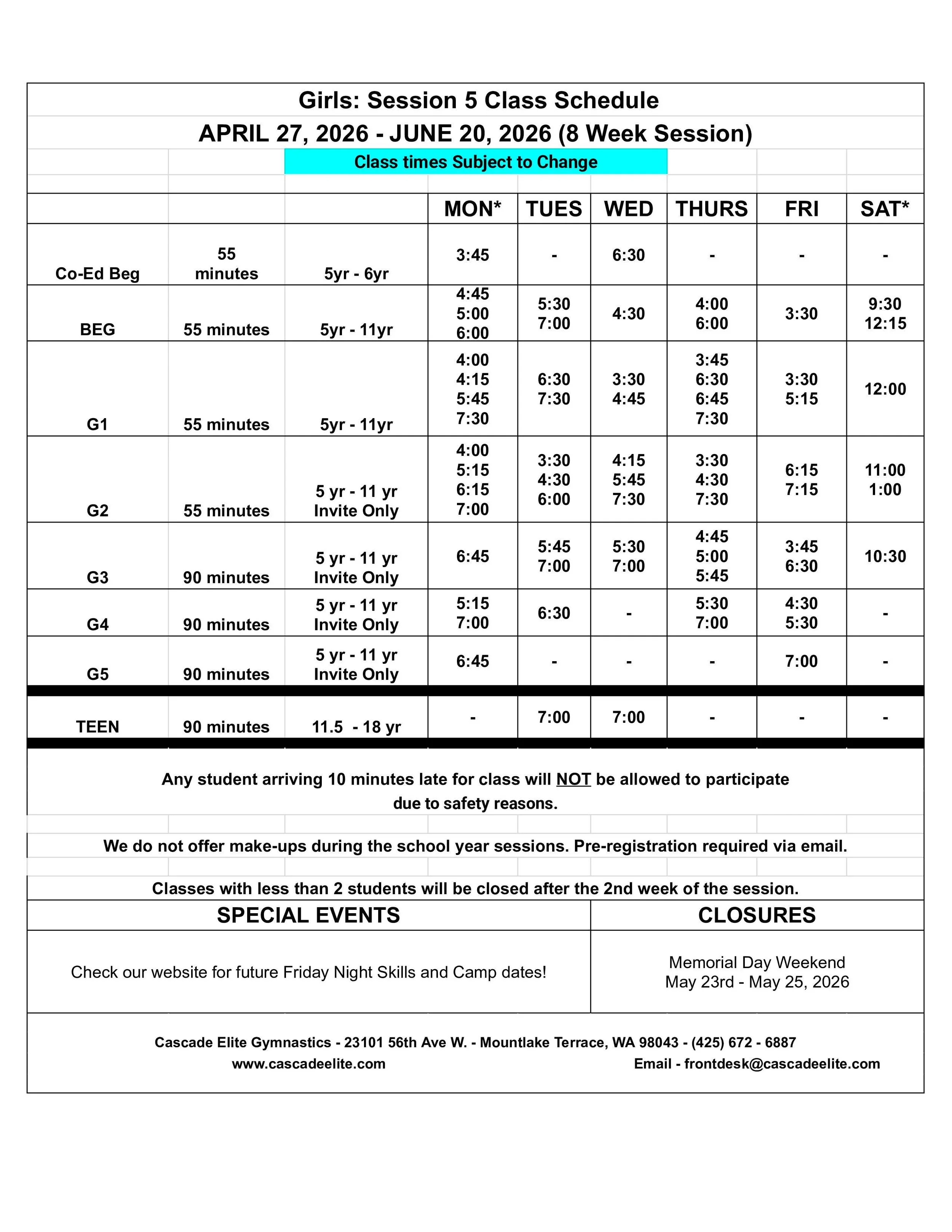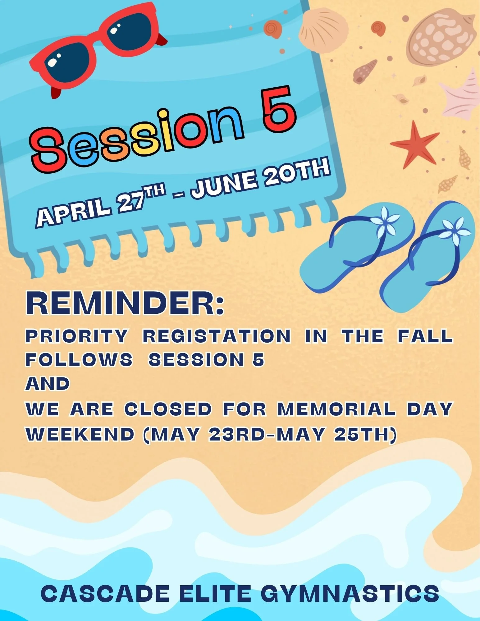 Session 5: April 27 - June 20, 2026. Closed Memorial Day Weekend